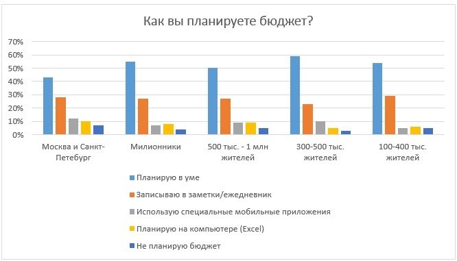 Около 50% опрошенных заявили, что предпочитают планировать бюджет в уме и не используют специальных инструментов. 30% ведут бюджет в заметках или ежедневниках, и очень немногие используют специальные приложения для планирования или Excel. При этом выбор не зависит от места проживания.