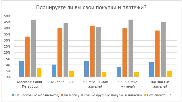 В Москве и Санкт-Петербурге планы на месяц строят 33% опрошенных, в других городах-миллионниках — 40%. В группе крупных городов с населением от 400-600 тыс. человек на месяц вперед расходы планируют 42% опрошенных, в городах с населением 300-500 тыс. человек — 40%, а в относительно небольших городах (100-300 тыс. человек) — 38%.