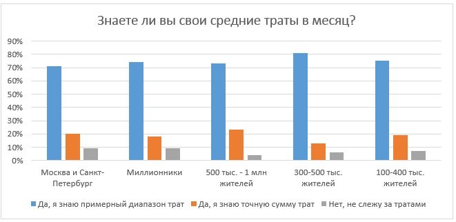 Несмотря на то, что большинство респондентов заявляют, что следят за своими тратами, точную сумму расходов может назвать лишь каждый пятый. 75% опрошенных ответили, что знают примерный диапазон ежемесячных трат. Лучше всего контролируют расходы в Москве, Санкт-Петербурге и миллионниках. В среднем 7% опрошенных рассказали, что не следят за конкретным размером трат.