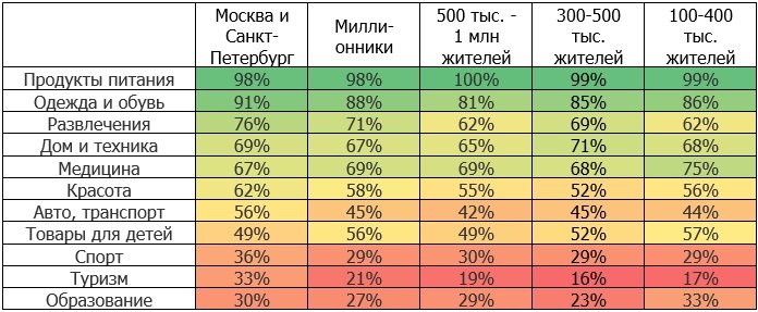 В Москве и Санкт-Петербурге по сравнению с другими регионами жители чаще тратят в категориях «Красота», «Спорт» и "Туризм. Значимой разницы в остальных категориях нет. В остальном расходы жителей больших и малых городов практически не различаются.