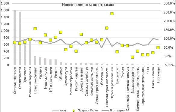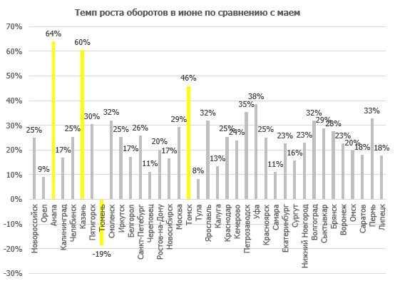 В июне обороты компаний в большинстве городов росли. Самый сильный прирост наблюдался в Анапе, Казани и Томске. Активное восстановление шло в Перми, Уфе, Волгограде, Пятигорске, Смоленске и Москве.