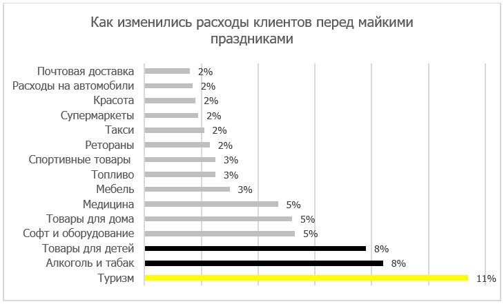 На втором месте по темпам роста перед праздниками оказались алкоголь и табачная продукция, где рост составил 8,4%, а на третьем — товары для детей с ростом на 7,8%. Также клиенты в России активно тратили на оборудование и софт, товары для дома и медицинские услуги, покупали мебель и топливо для автомобилей.