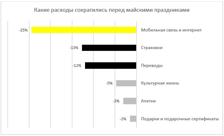 Одновременно клиенты значительно сократили расходы на мобильную связь, услуги интернета, страховые продукты и снизили количество денежных переводов. Также упал спрос на билеты в музеи, на культурные мероприятия и товары в аптеках. При этом спрос на одежду оставался стабильным.