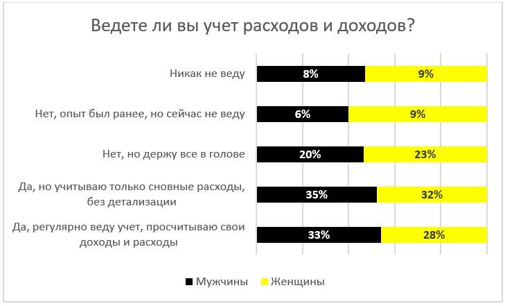 Мужчины ведут учет расходов чаще женщин — в среднем 33% против 28% анализируют расходы подробно.