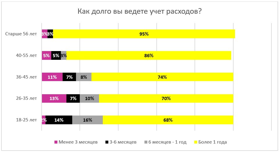 Учет расходов для клиентов — это не новая привычка. 76% респондентов ведут бюджет уже больше года. Однако значимо большая доля новичков оказалась в группе 26–45 лет — 11–13% респондентов ведут бюджет меньше трех месяцев, а по 7% делают это всего 3–6 месяцев. Их отношение к личным финансам значительно изменилось за последний год, что может быть связано с карантином и его последствиями.